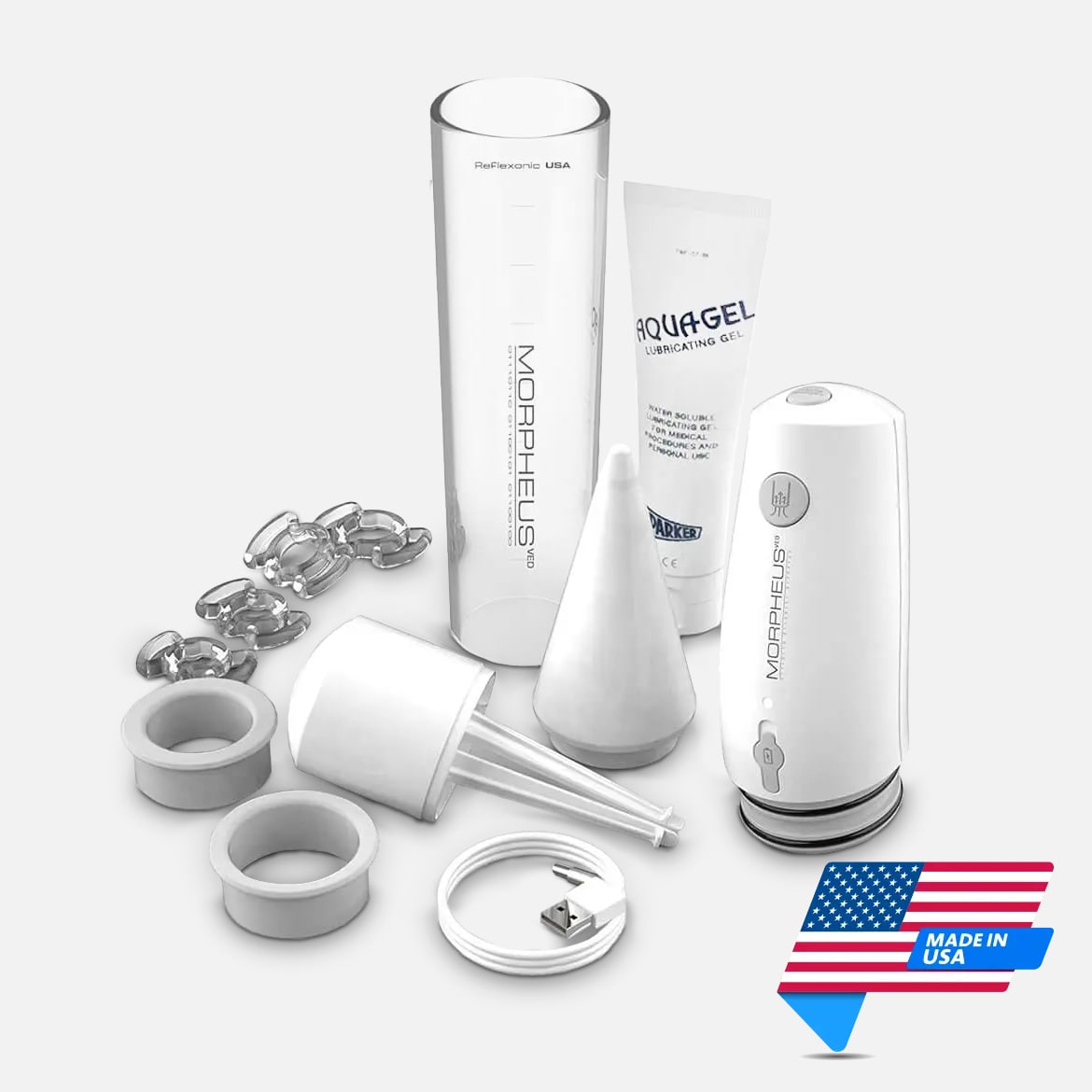 The Morpheus VED System uses whisper-quiet electronic suction to draw blood safely into the penis, then holds it with a snug constriction ring so you can focus on intimacy, not performance worries.